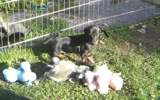 At 4 weeks, There are more first experiances. They got the first chance to explore outside in the ex-pen They are enjoying all the new toys and the chance to play outside in the grass !